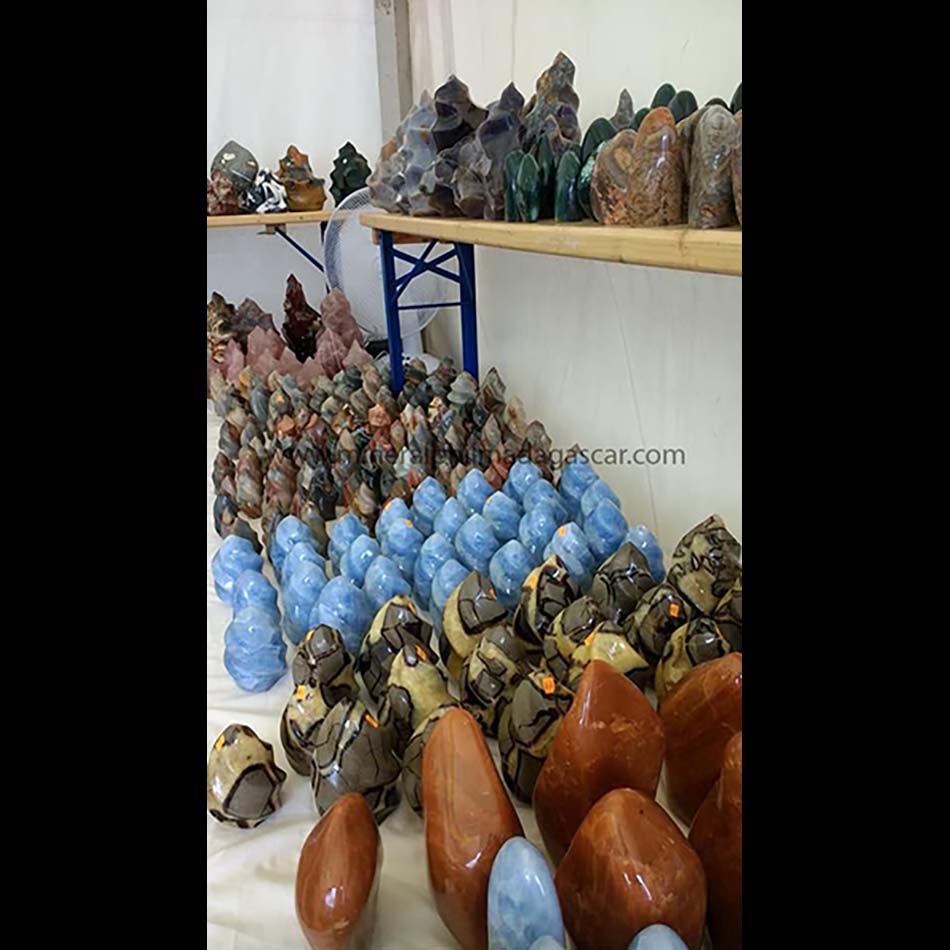 We sell all minerals you can find in Madagascar, such as labradorite, crystals, carnelian, rose quartz, agate, amethyst, fluorite, blue calcite, amazonite, polychrome jasper, ocean jasper, kambamba jasper, black septaria, celestite, green opal, inclusion quartz, clear quartz and many more. The stones are worked in different shapes such as free forms, spheres, eggs, tumbled stones, hearts, tables top, slabs, clusters, points, skulls, massage wands, flames, bowls, ahstrays, pendants and other shapes. We also have rough stones, and fossils like urchins and ammonites.